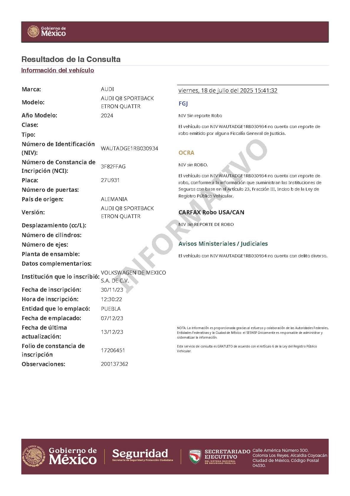 WAUTADGE1RB030934 Audi Q8 Sportback 55 e-tron quattro 300 kW S line, 2024. 28,761 Km. La unidad se ubica en San José Chiapa, Puebla. Se factura con IVA al 16%. Se entrega copia de la factura de origen, baja de placas y último control vehicular.